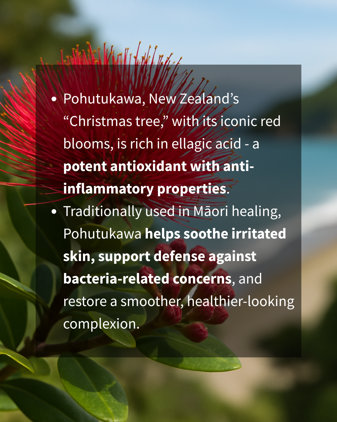 - Pohutukawa, a native botanical of New Zealand, has anti-inflammatory and anti-microbial properties. It helps to soothe, condition and calm irritated or inflamed skin. And helps address certain skin concerns related to bacteria.