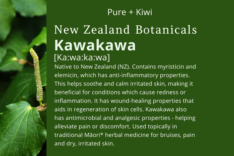 - Kawakawa has anti-inflammatory properties. Reducing inflammation contributes to a smoother and firmer appearance. It is effective in reducing redness and discomfort associated with dryness. It also has antioxidants - such as vitamin E - which nourishes skin and can prevent premature aging and damage to the skin.